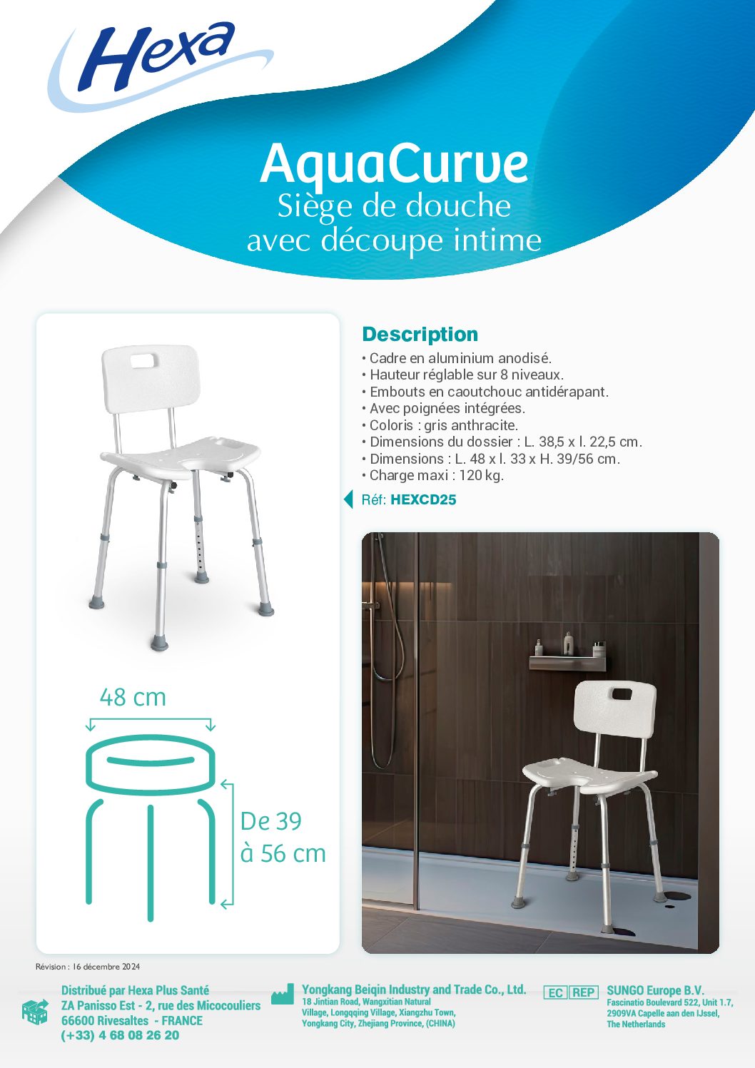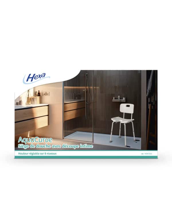 Utilisation et entretien : Le siège de douche AquaCurve est simple à nettoyer avec un chiffon humide et un savon doux. Il est recommandé de vérifier régulièrement le serrage des réglages pour une sécurité optimale.