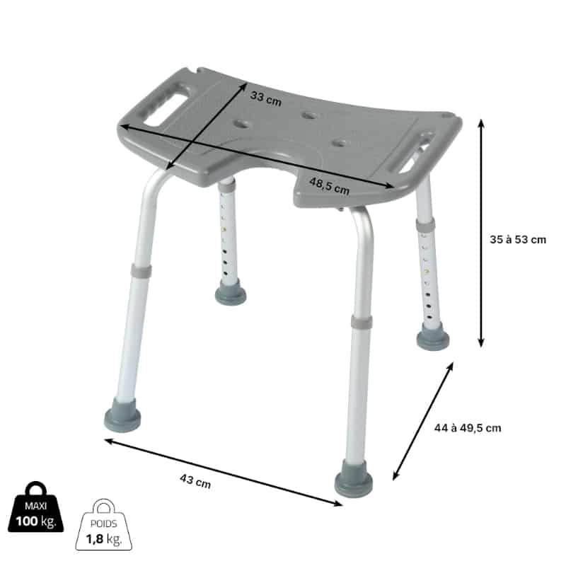 Dimensions assise : largeur ~ 48,5 cm × profondeur ~ 33 cm × hauteur réglable ~ 35 à 53 cm.