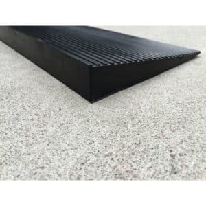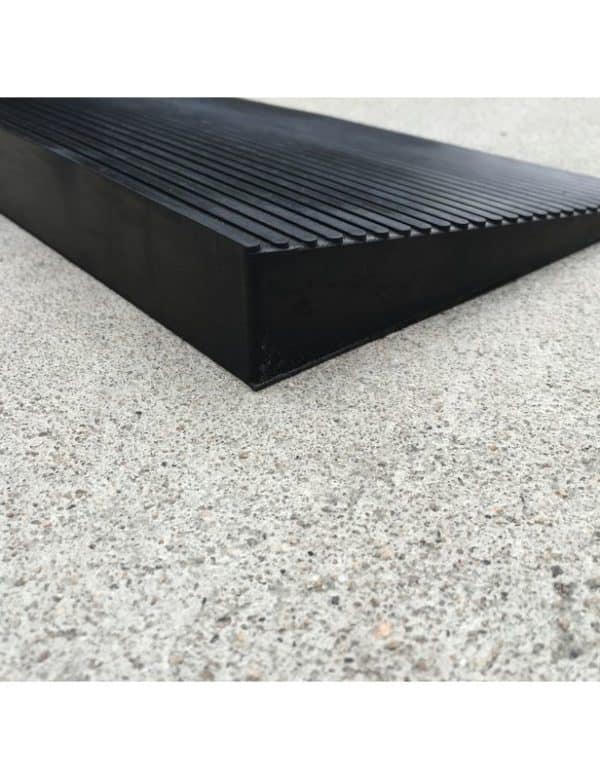 Rampe de seuil biseautée en matériau antidérapant, conçue pour faciliter le passage des fauteuils sans déformation.
