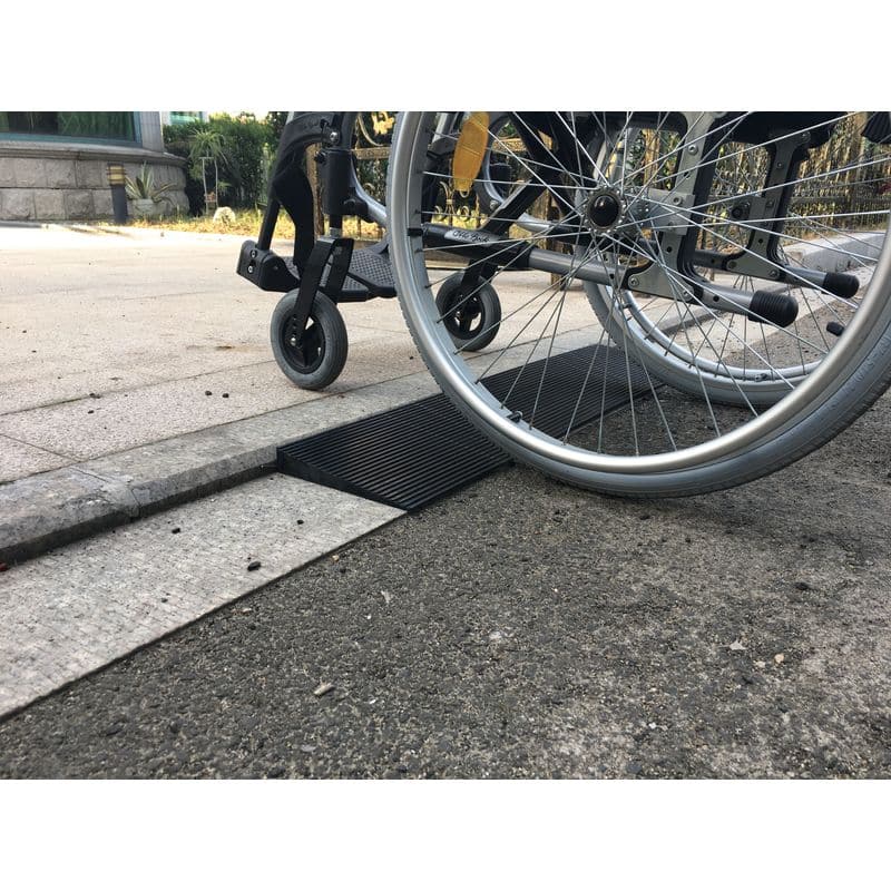 Rampe de seuil biseautée en matériau antidérapant, conçue pour faciliter le passage des fauteuils sans déformation.
