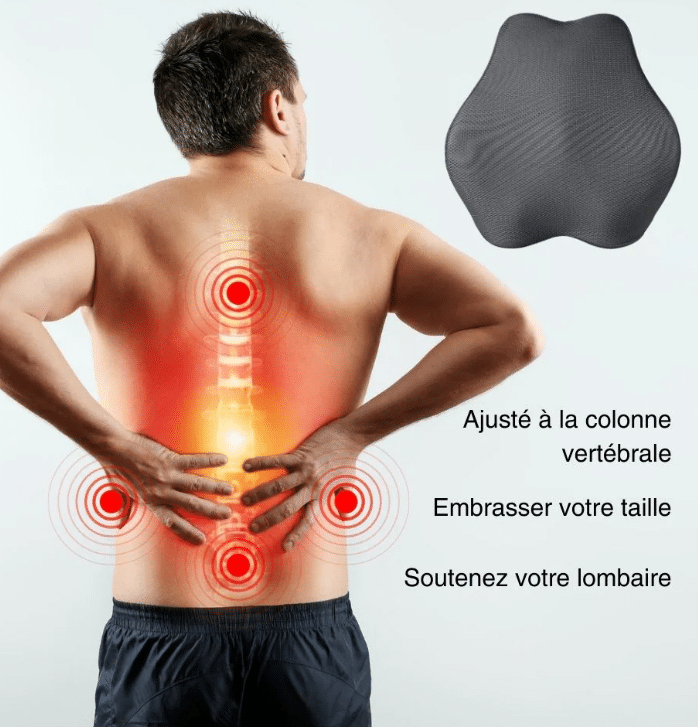 Coussin de soutien lombaire ergonomique allongé Inphysio, spécialement conçu pour améliorer la posture assise et soulager les douleurs lombaires. Sa mousse à mémoire de forme haute densité (55 kg/m³) épouse parfaitement les courbes naturelles de la colonne vertébrale, réduisant les points de pression et la tension dorsale lors des positions assises prolongées.