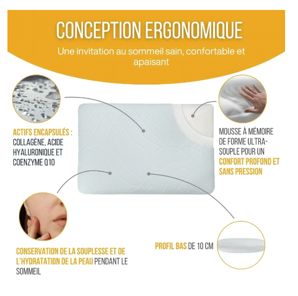 Un oreiller ergonomique à mémoire de forme extra-souple, associé à une taie fonctionnelle DermaColl enrichie en collagène, acide hyaluronique et coenzyme Q10. Pendant la nuit, les microcapsules libèrent progressivement leurs actifs pour hydrater la peau, atténuer les marques du sommeil et contribuer à un réveil avec un visage plus lisse et reposé.