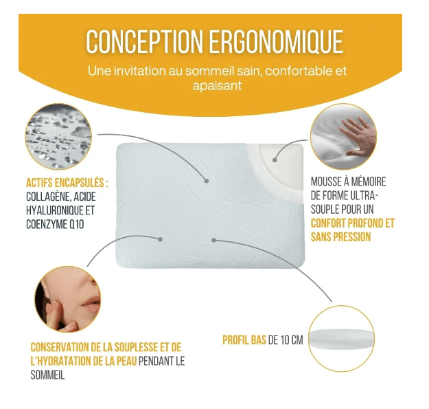 Un oreiller ergonomique à mémoire de forme extra-souple, associé à une taie fonctionnelle DermaColl enrichie en collagène, acide hyaluronique et coenzyme Q10. Pendant la nuit, les microcapsules libèrent progressivement leurs actifs pour hydrater la peau, atténuer les marques du sommeil et contribuer à un réveil avec un visage plus lisse et reposé.