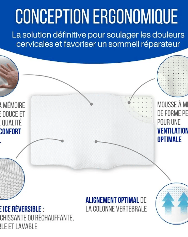 Grâce à sa nouvelle forme unique et innovante, l’oreiller ergonomique ERGO a été conçu pour offrir un soutien cervical optimal tout en répondant à des besoins spécifiques comme la prévention des rides du sommeil, le bruxisme, le SADAM et les acouphènes.
