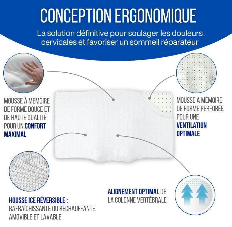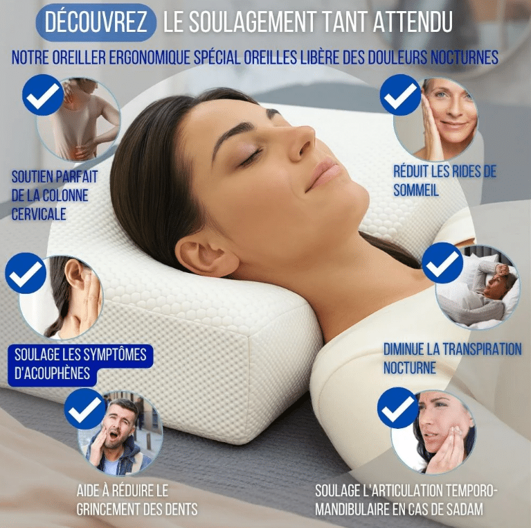 Grâce à sa nouvelle forme unique et innovante, l’oreiller ergonomique ERGO a été conçu pour offrir un soutien cervical optimal tout en répondant à des besoins spécifiques comme la prévention des rides du sommeil, le bruxisme, le SADAM et les acouphènes.