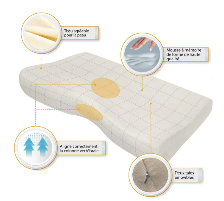 Grâce à sa mousse à mémoire de forme thermoélastique, l’oreiller s’adapte à la chaleur du corps et répartit les points de pression de manière homogène. Il permet ainsi de soulager efficacement les douleurs cervicales, de réduire les tensions musculaires et de prévenir les inconforts liés aux mauvaises postures nocturnes.
